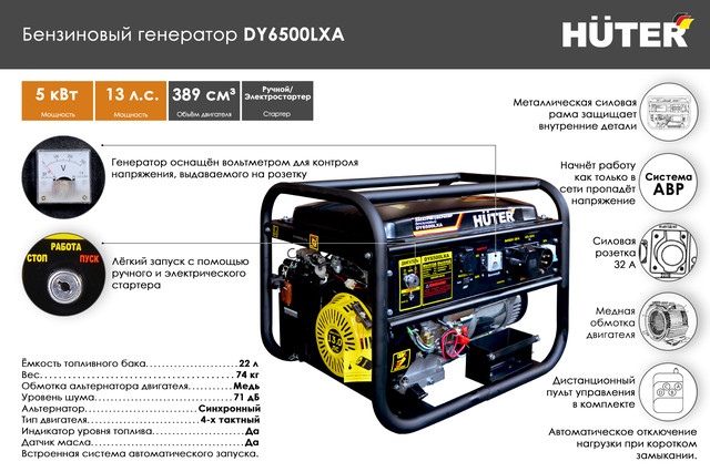 Модель Huter DY6500LXA снабжена системой автозапуска при активации функции АВР (автоматическое включение резерва), предотвращающей сбои в сети при отключении магистрального питания. Электрогенератор Huter DY6500LXA оборудован автоматизированной электронной регулировкой оборотов двигателя с адаптацией рабочего режима под изменения нагрузки.